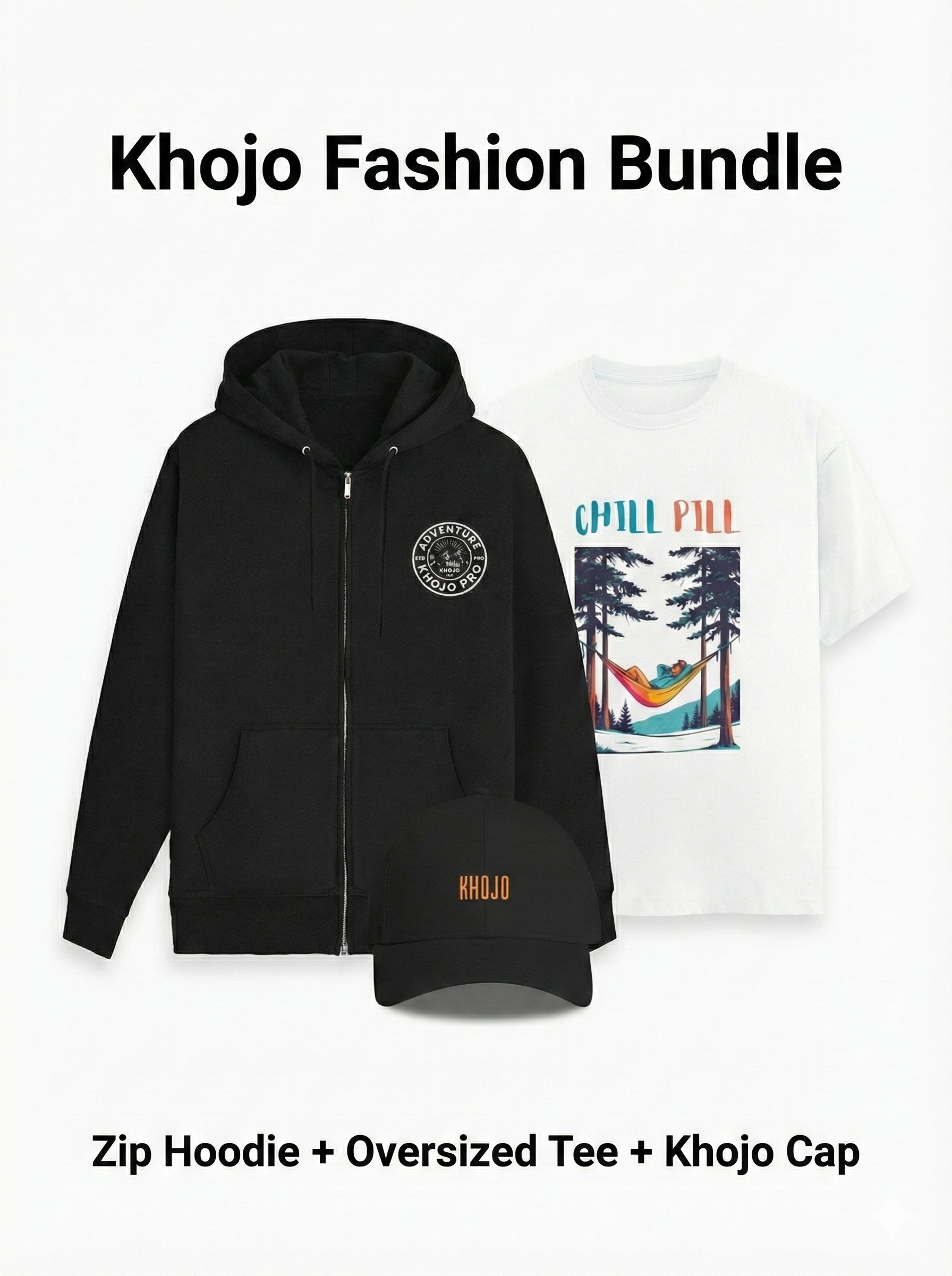 Upgrade your travel style with the Khojo Fashion Bundle – featuring the cozy Khojo Zipper Hoodie, a bold Oversized Travel Tee, and the signature Khojo Tucker Cap. Designed for explorers who live for new destinations, this bundle brings comfort, durability, and adventure-ready style in one perfect combo. Whether you are hitting the road, exploring mountain trails, or discovering new cities, your travel look is sorted. Pack light, travel smart, and Go Khojo.