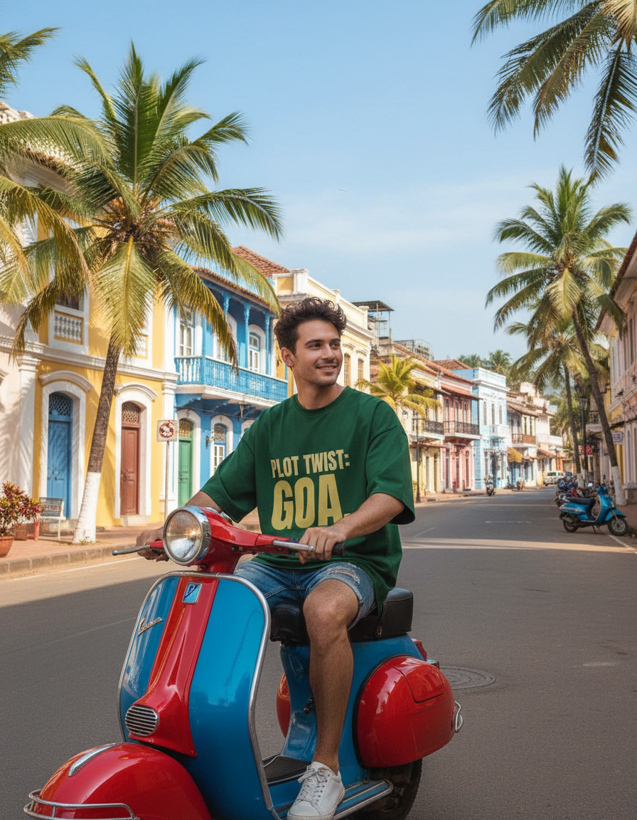 “Plot Twist. Goa.” — an oversized travel t-shirt made for travelers who chase sunsets over schedules.